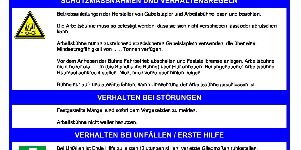 Die Betriebsanweisung ist eine Anweisung des Arbeitgebers an seine Mitarbeiter, damit diese einen sicheren Umgang mit den Arbeitsmitteln haben. So fordert es die Betriebssicherheitsverordnug (BetrSichV).